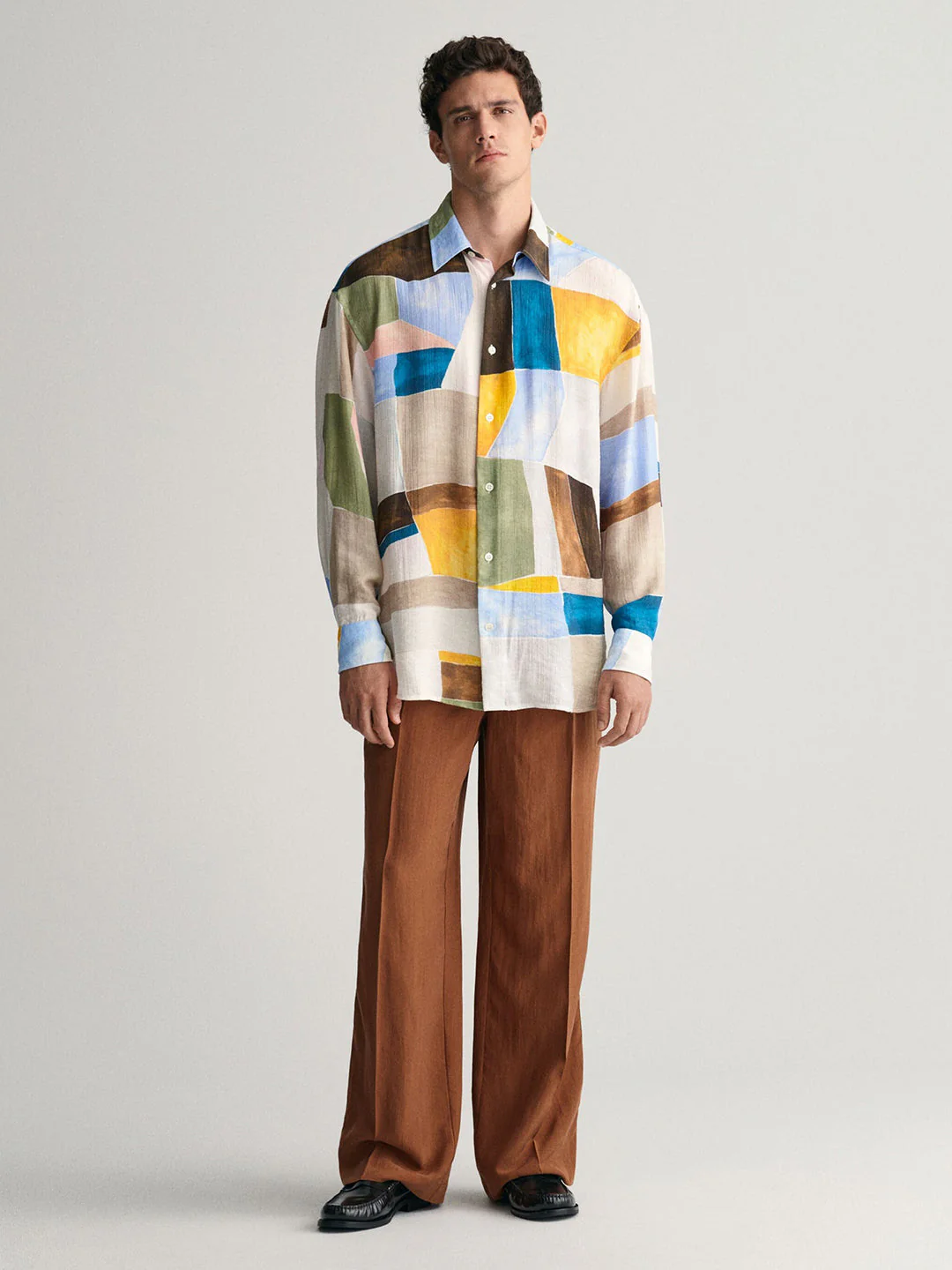 Experience comfort and style with this multicolored, oversized shirt for men. Designed in a unique colorblock pattern, it features full sleeves and a spread collar. Crafted from a blend of viscose and polyamide, it ensures a soft, comfortable fit.