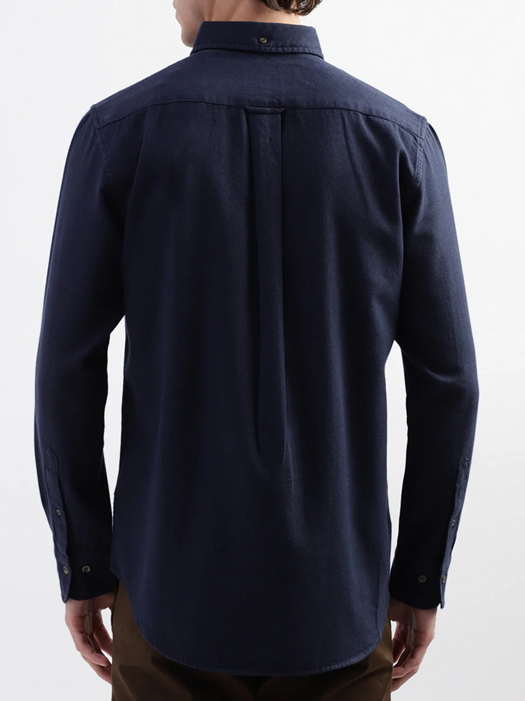 Elevate your style with this navy blue solid button-down collar shirt for men. Crafted with full sleeves and 100% cotton material, it combines comfort with timeless elegance. Versatile for both formal and casual occasions, it's a wardrobe essential that exudes sophistication.