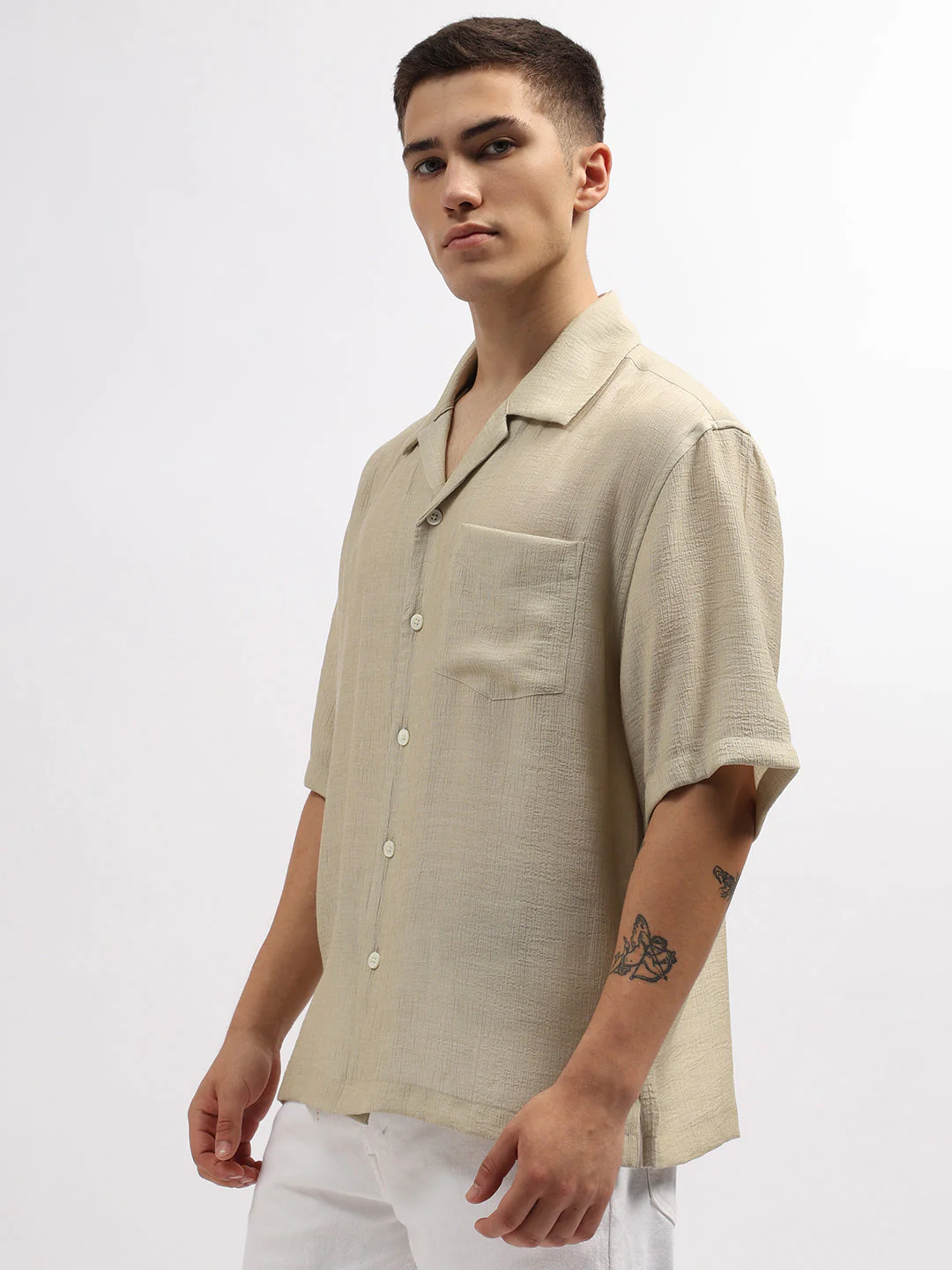 Discover effortless style with our beige, textured-pattern shirt. Designed for comfort, this relaxed-fit piece features short sleeves, a chic Cuban collar, and a smooth viscose blend fabric. The button closure adds a classic touch, making it perfect for both casual and sophisticated looks. Elevate your wardrobe with this versatile must-have.