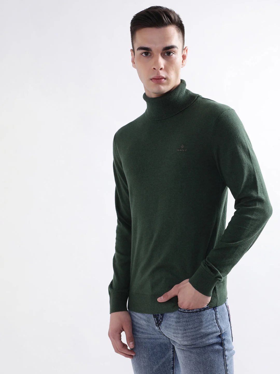 Embrace cozy sophistication with this green sweater, crafted from a soft cotton blend. Its solid pattern and full sleeves offer a timeless appeal, while the turtle neck adds a touch of elegance. Perfect for layering or wearing solo, this pull-on piece is a versatile essential for any modern mans wardrobe.