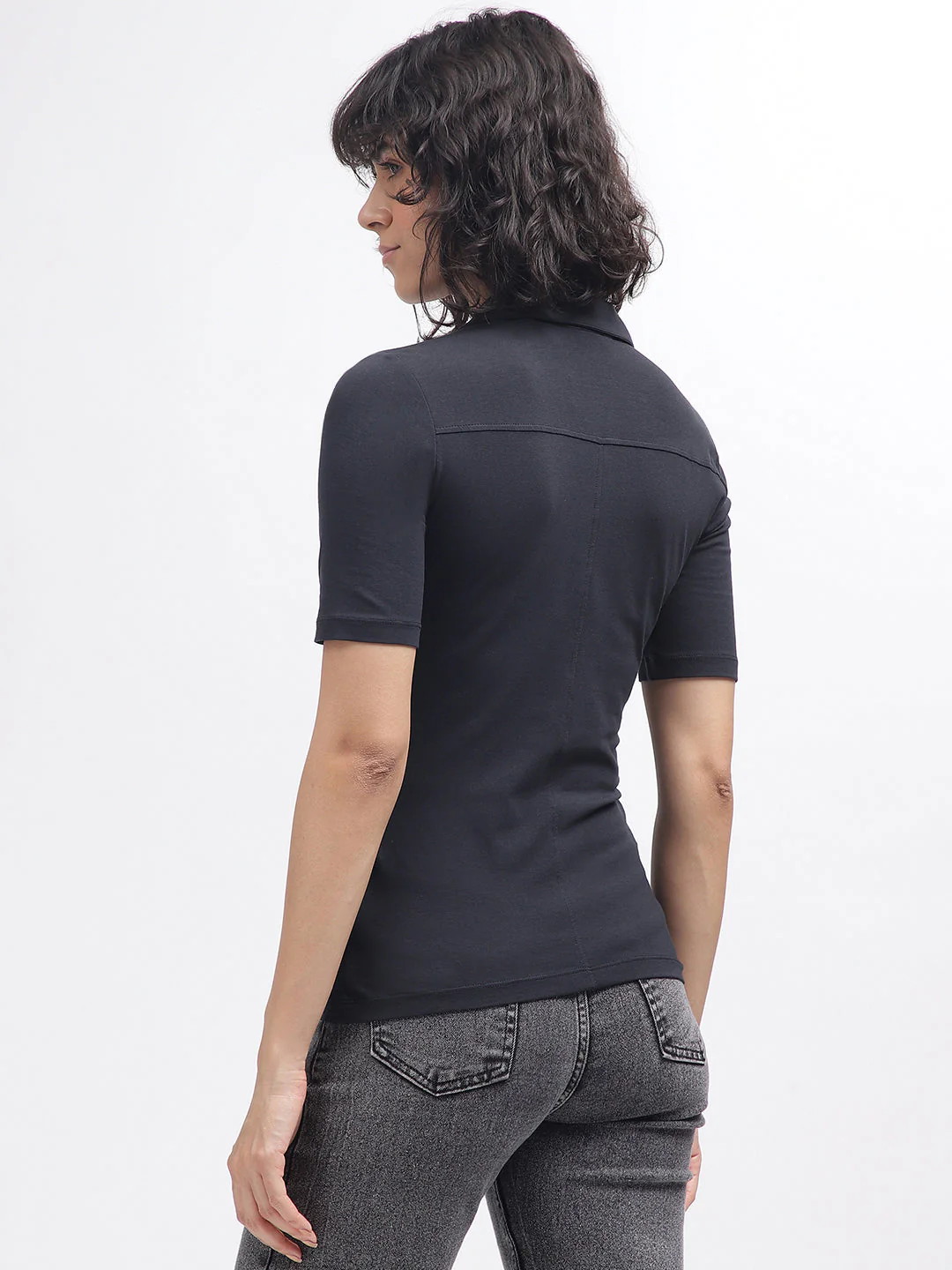Gant Women Black Solid Polo Collar Short Sleeves T-Shirt