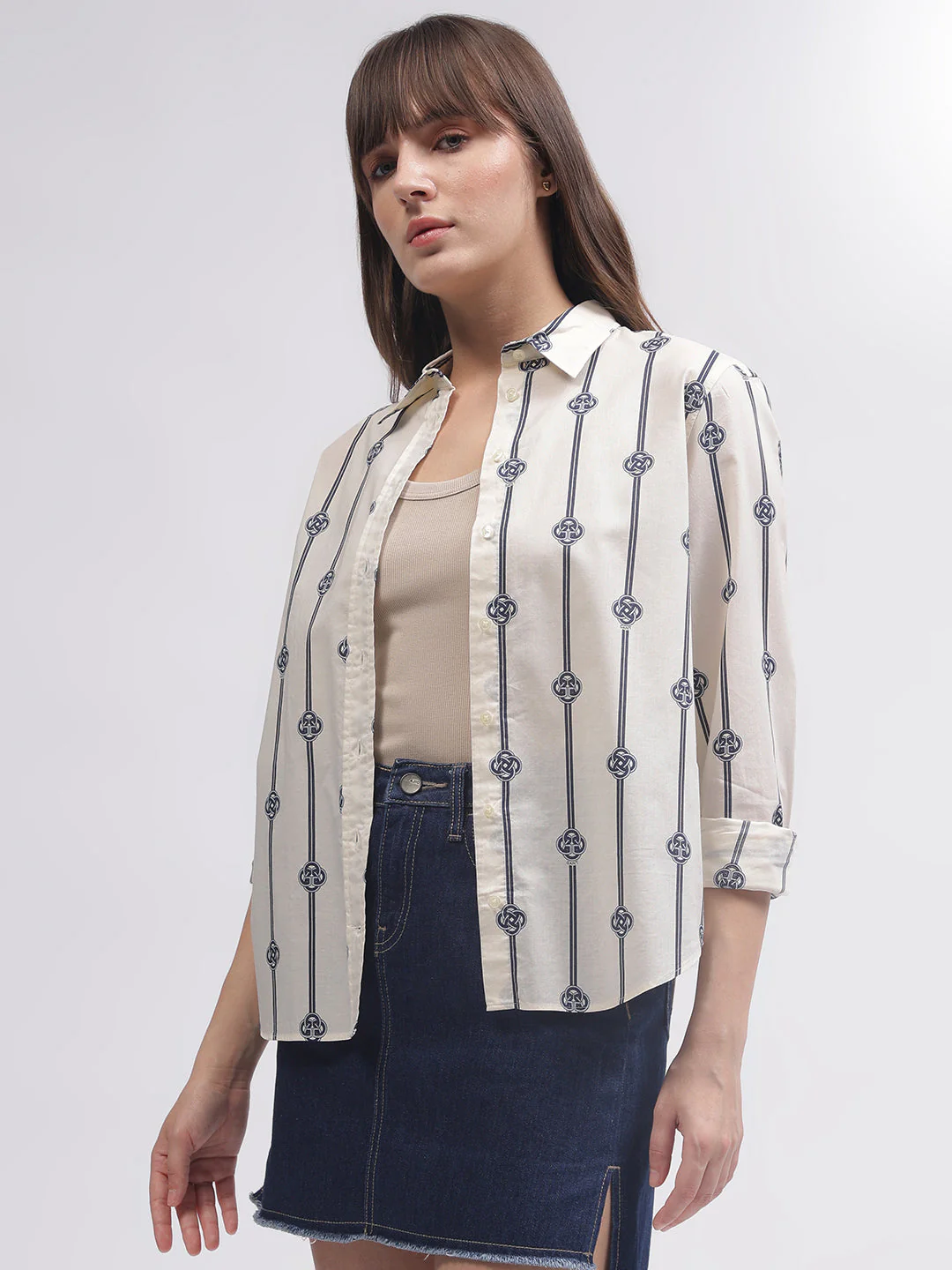 Stay effortlessly chic with this white printed shirt for women. Featuring a regular fit, full sleeves, and a spread collar, this shirt offers both comfort and style. The button closure adds a touch of sophistication, making it perfect for any occasion.