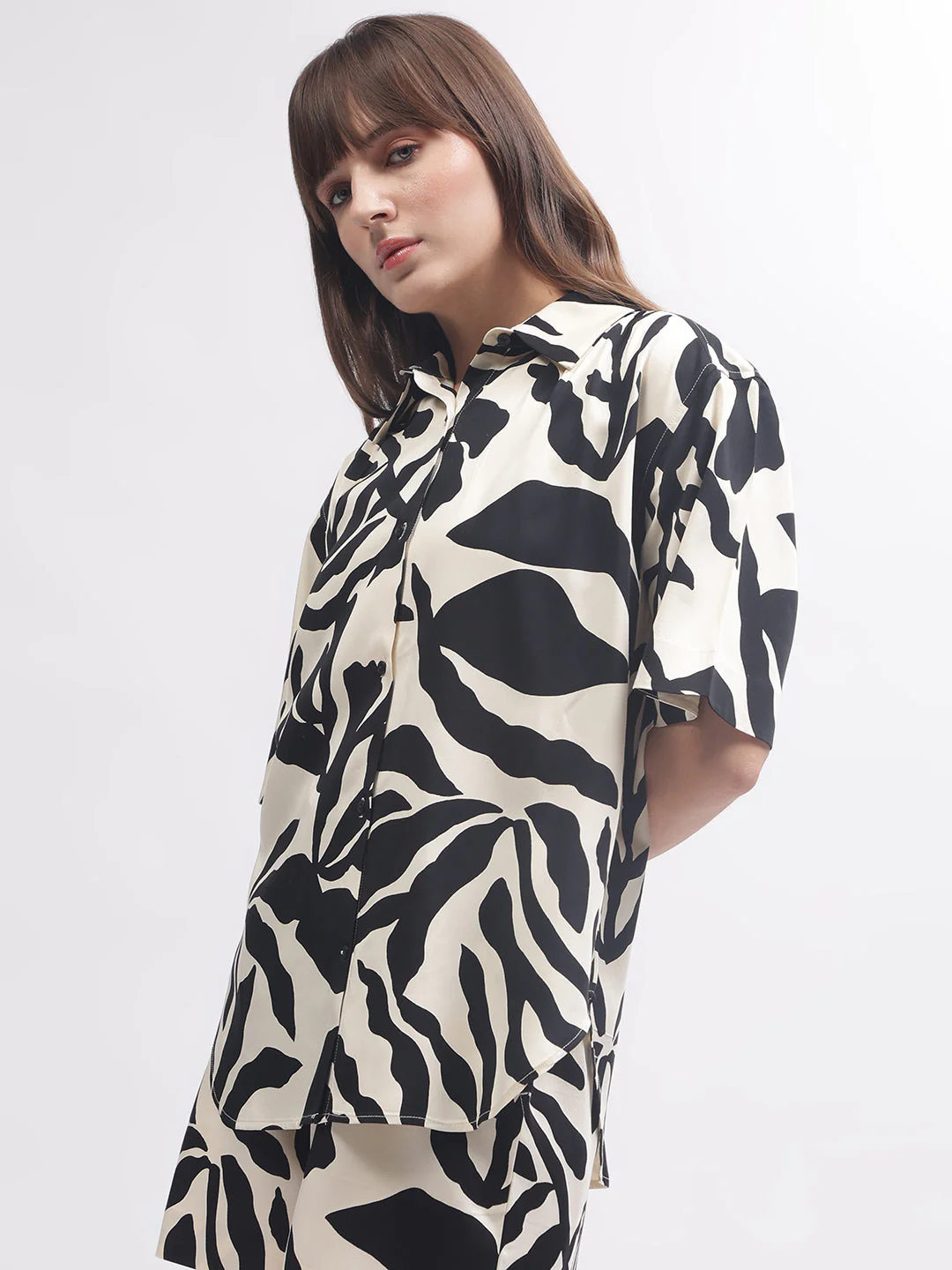 Effortlessly stylish, this beige shirt for women features a relaxed fit with a printed pattern, short sleeves, and a spread collar. Its button closure adds a touch of sophistication, making it a versatile and chic addition to any wardrobe.